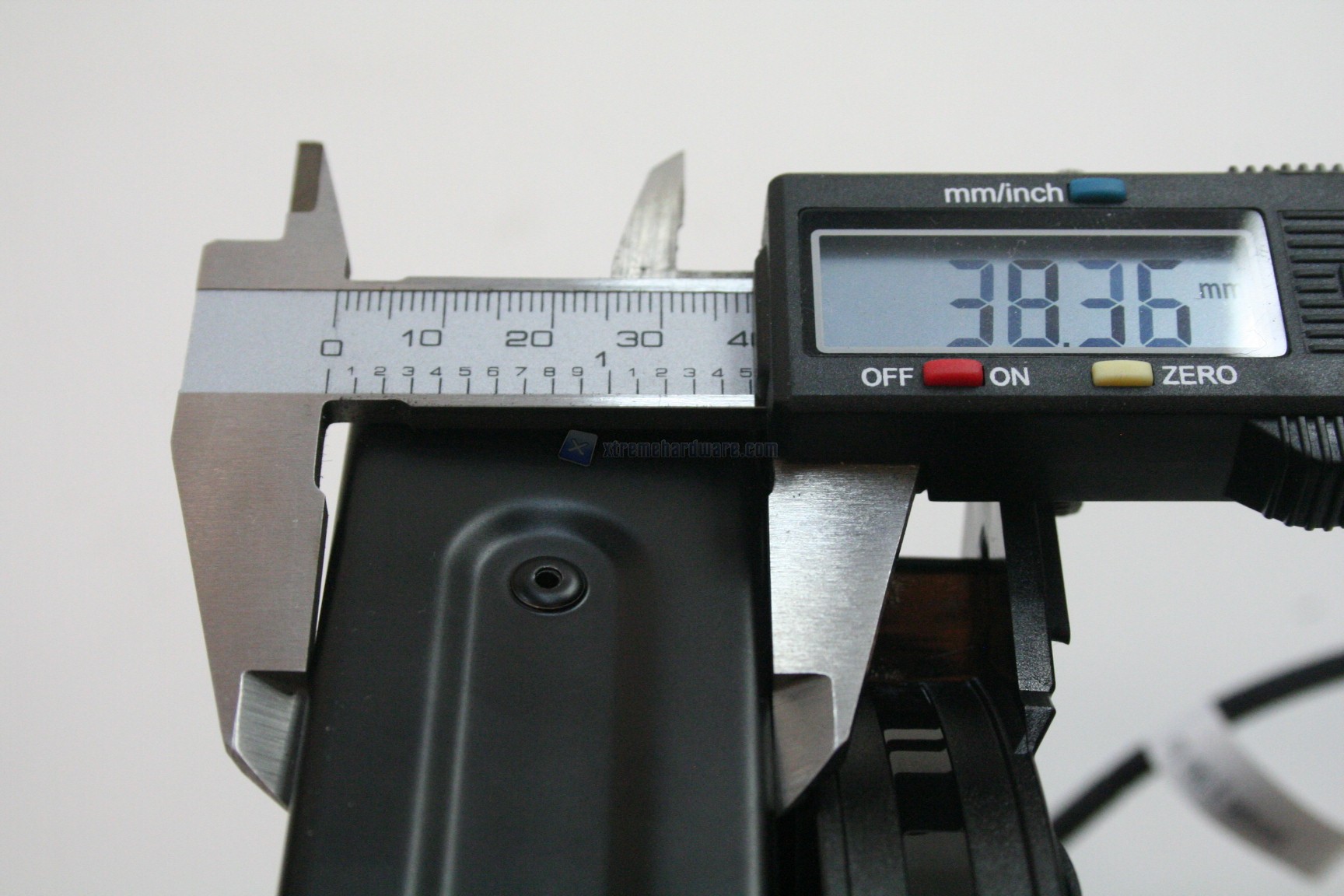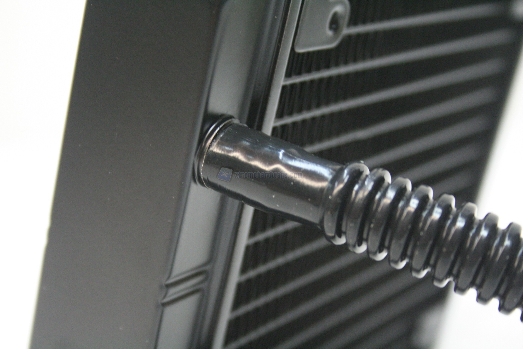 Le tubazioni sono di una tipologia simile ai vecchi modelli Corsair, ma con una sostanziale differenza per quanto concerne il diametro interno, in questo caso ben maggiore. La lunghezza non è eccessiva ma la rigidità è medio/alta, ragion per cui sarebbe consigliabile montarlo nel classico posizionamento laterale in una conformazione ATX, ovvero con il radiatore a contatto della ventola in espulsione del case. Il diametro dei tubi, reale, è leggermente inferiore a quello che potete osservare direttamente all’esterno, anche se non è chiaro se sia presente una tubazione interna che non permetta quindi al fluido interno di sbattere contro le insenature radiali del tubo stesso. Sarebbe necessario segarlo in due, e si comprende chiaramente che ciò non è ovviamente possibile ai fini della recensione. Facciamo presente che c’è un meccanismo di inserimento dell’acqua nel radiatore, tramite un tubo collettore svitabile. Qualora fosse aperto però la garanzia verrebbe invalidata e data la caratteristica di questi modelli che permette la mancanza di una periodica manutenzione, è assolutamente sconsigliabile aprirla. E’ possibile che serva per fini di riparazione o test pre-vendita o assemblaggio. In sostanza quindi siamo dinanzi ad una soluzione che si differenzia dalle precedenti, certamente più economica delle soluzioni Eisberg, ma sempre di ottima qualità. Qualche fotografia dello spessore con le ventole: