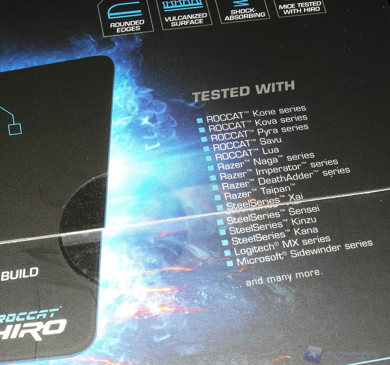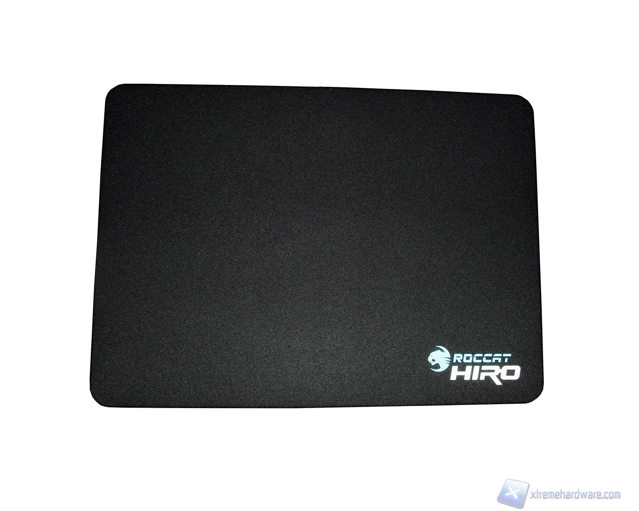 Il ROCCAT Hiro è di medie dimensioni, tuttavia nonostante i suoi 350x250 mm lo spessore è di soli 2,5 mm, aspetto importante nella scelta di un mousepad. La superficie, morbida, è resa particolare dal trattamento vulcanizzante alla quale è stata sottoposta, ottenendo un effetto bucciato (o 3D) per massimizzare la tracciatura del mouse. In basso a sinistra è inoltre presente il logo ROCCAT.