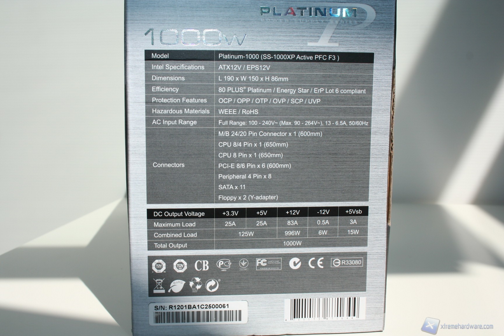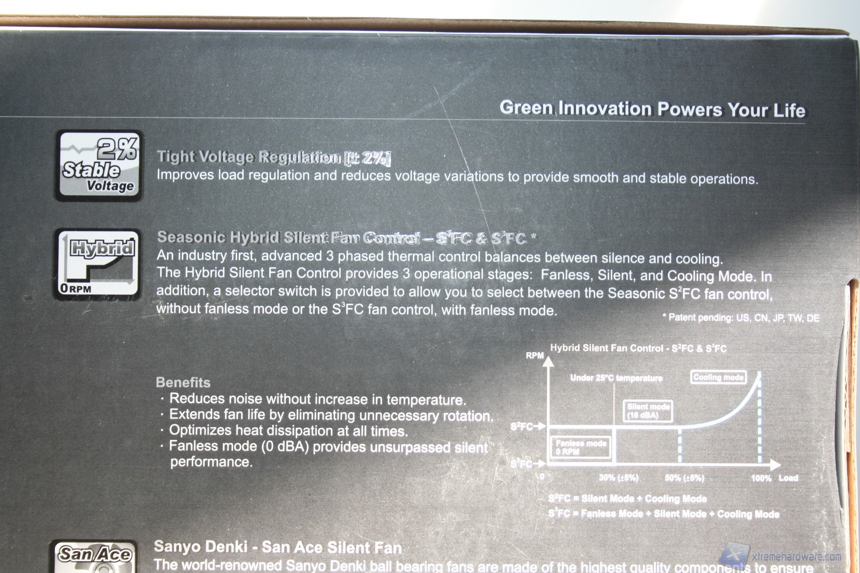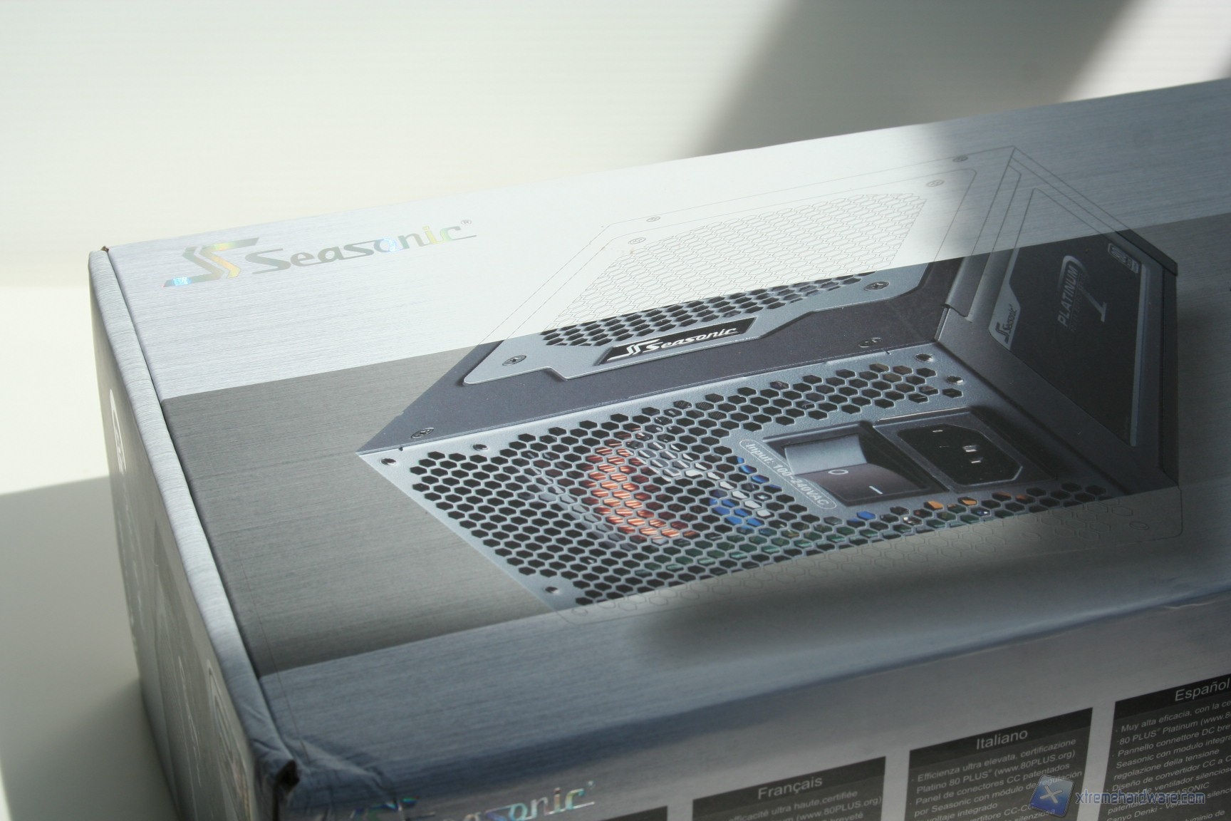 La confezione esterna è di medie dimensioni, dal layout decisamente ordinato, pulito ed elegante, sia nell’esposizione delle informazioni, che sono in gran numero e molto approfondite, sia nell’organizzazione interna delle componenti. La colorazione è grigio-azzurrina, con decalcomanie riflettenti la luce. Nella parte posteriore della confezione si può già apprezzare la qualità dei componenti adottati da Seasonic per questa soluzione, grazie a una fotografia interna del layout del PCB e delle componenti onboard con annessa spiegazione.