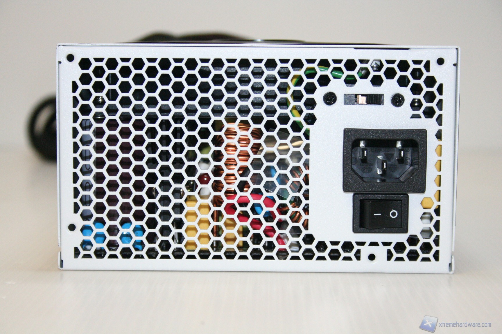 Lateralmente ed in alto a sinistra, guardando posteriormente, c’è uno sticker che avvisa l’utente della perdita della garanzia qualora dovesse essere rimosso, o forato, nell’intento di rimuovere la scocca. Posteriormente sono presenti invece le classiche fessure d’aerazione esagonali con layout a nido d’ape assieme all’ingresso della corrente, dove troviamo un posizionamento classico del pulsante di accensione, che ha dimensioni standard. Vicino a quest’ultimo troviamo il selettore della modalità normale e silenziosa, che però non presenta la minima indicazione riguardo alla variante selezionata, ma bisogna spostare lo switch verso destra per attivare la modalità ‘’normale’’, in quanto parte di fabbrica con quella Silent. Attivando la variante silenziosa, la ventola non viene attivata fino al 50% del carico (600W), a condizione che la temperatura ambiente non sia eccessiva.