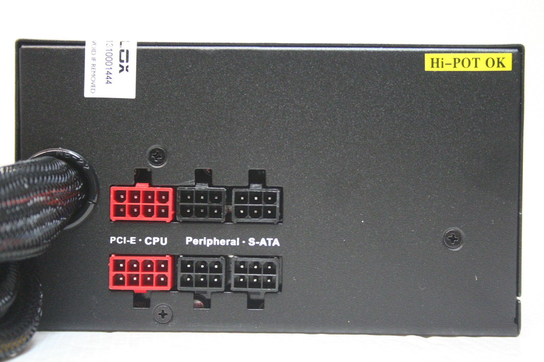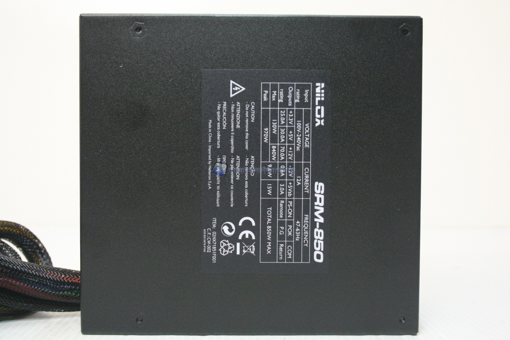 Lateralmente, in alto, c’è uno sticker che segnala la perdita della garanzia della casa produttrice qualora dovesse essere rimosso o forato, per permettere lo smontaggio della scocca, cosa presente nella quasi totalità degli alimentatori attualmente in commercio. Posteriormente sono presenti invece le classiche fessure d’aerazione, esagonali a nido d’ape assieme all’ingresso della corrente.