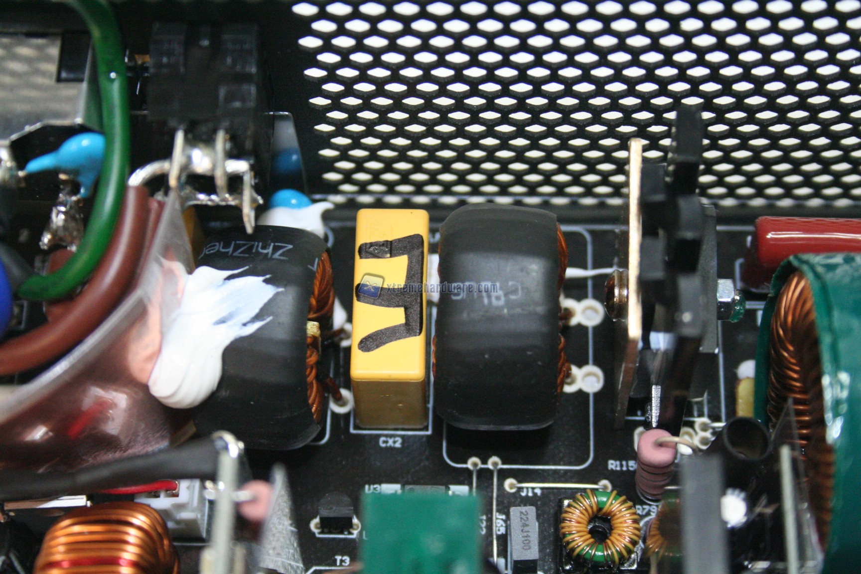 Il primo elemento di un alimentatore moderno è il sistema di filtraggio delle emissioni elettromagnetiche e radio, precisamente l’EMI/RFI Transient Filter. Viene posizionato necessariamente dietro all’ingresso della corrente AC e sono state incluse le necessarie componenti affinché non ci siano interferenze elettromagnetiche, tra cui due condensatori ad Y nel primo stadio; a seguire sul PCB principale troviamo un MOV (MOV: Metal Oxide Varistor), un condensatore ad X, un induttore toroidale, due condensatori ad Y, un altro condensatore ad X ed infine un altro induttore toroidale.