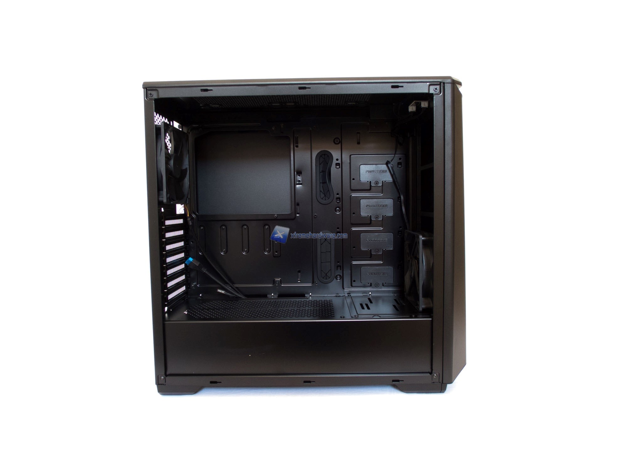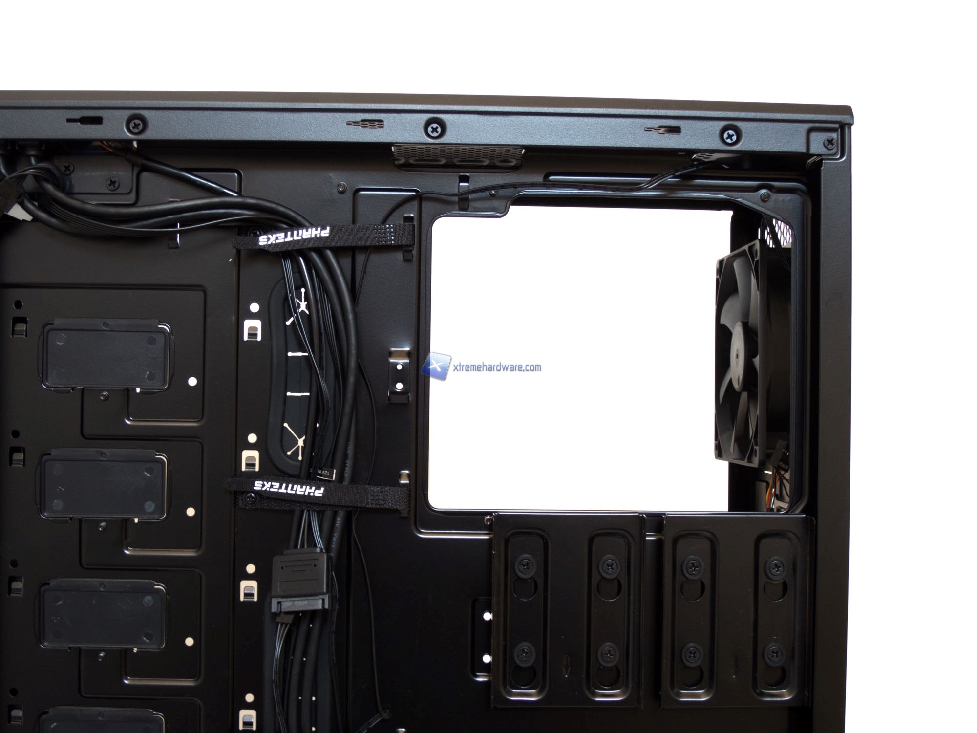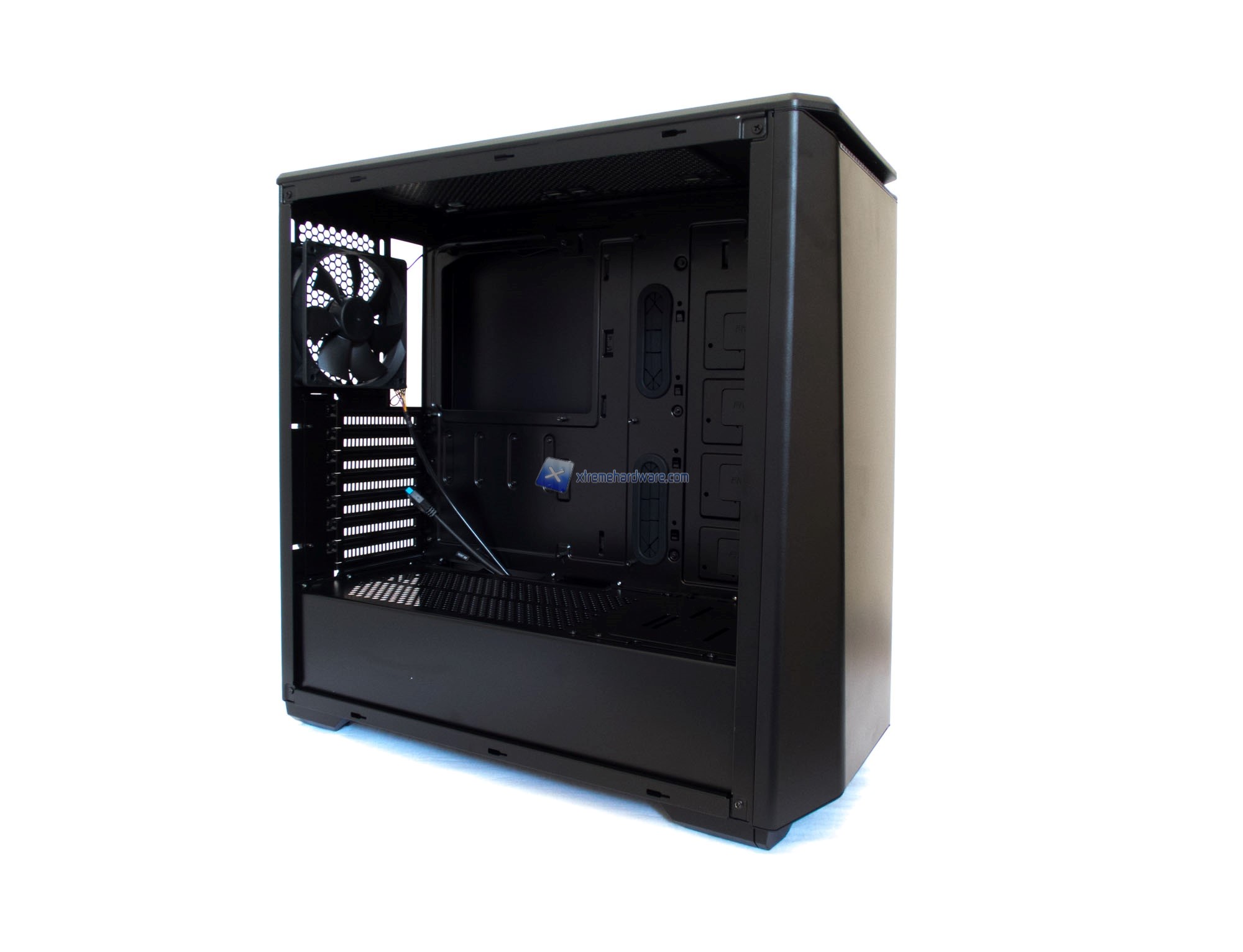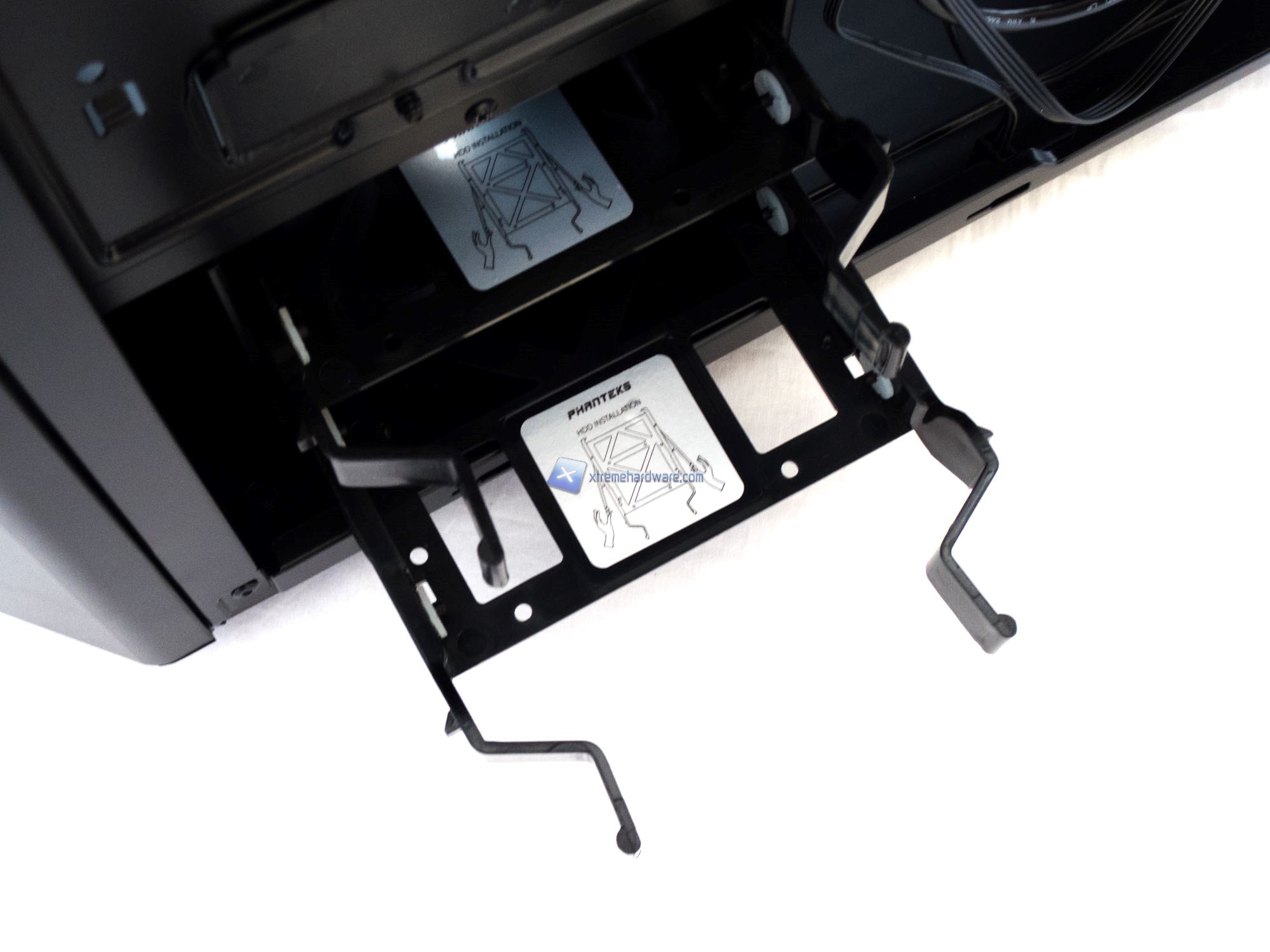 Inferiormente al Tray, trova posto anche il classico e immancabile Midplate forato (per ottimizzare anche il ricircolo di aria) che coprirà l’alimentatore e cavi da esso provenienti, a tutto vantaggio del design e dell’ordine. Per il P400 non troviamo nessun riferimento al brand o il classico supporto per un SSD laterale come in altri modelli. Notiamo invece come il Midplate nel lato destro sia caratterizzato dalla presenza di un piccolo plate chiuso da poche viti. Rimuovendo le viti e il plate avremo a disposizione circa 13 cm per installare, come dicevamo, un radiatore in configurazione Push/Pull ma solo rimuovendo a sua volta anche il cage Hard Disk posto nella parte inferiore posteriore.