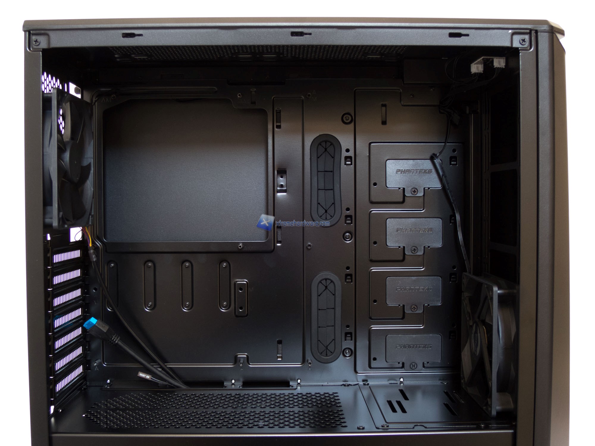 Una volta rimosse le paratie laterali possiamo accedere all’interno del case. Lo spazio offerto dal P400 è in parte molto simile a quanto visto già con l’Enthoo Pro M. Precisamente ci riferiamo al fatto che Phanteks ha deciso di rimuovere del tutto i cage principali delle periferiche 5,25” e degli Hard Disk offrendo un design modulare e personalizzabile. Nelle ultime serie e case Phanteks troveremo solo dei piccoli plate con la scritta Phanteks che insieme a supporti/slitte in plastica acquistabili a parte ci permetteranno di montare Hard Disk in formato 3,5’’ nella loro classica posizione. In caso contrario avremo più spazio per i componenti HW principali. Ovviamente è scomparsa la possibilità di inserire unità ottiche da 5,25”.