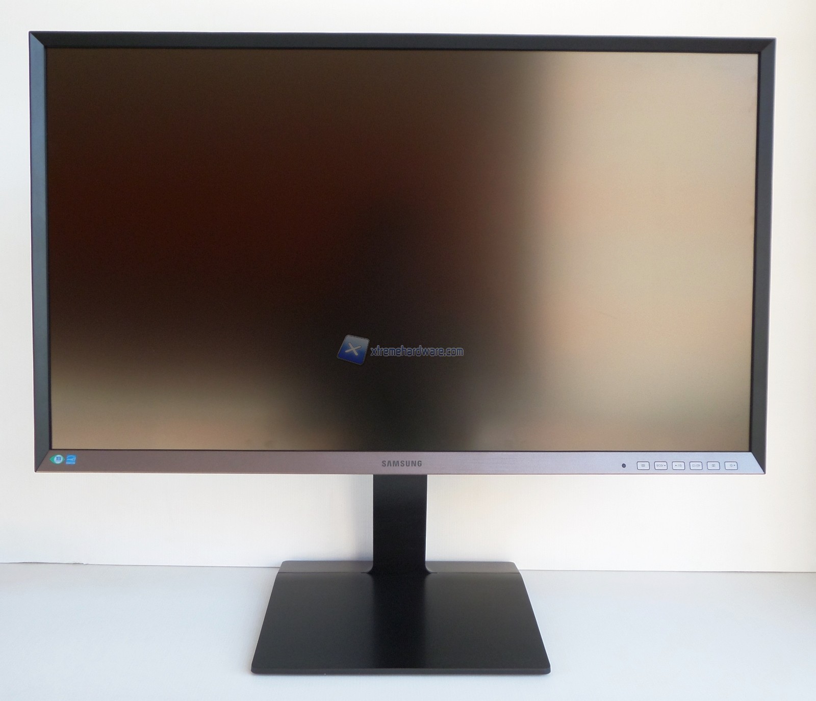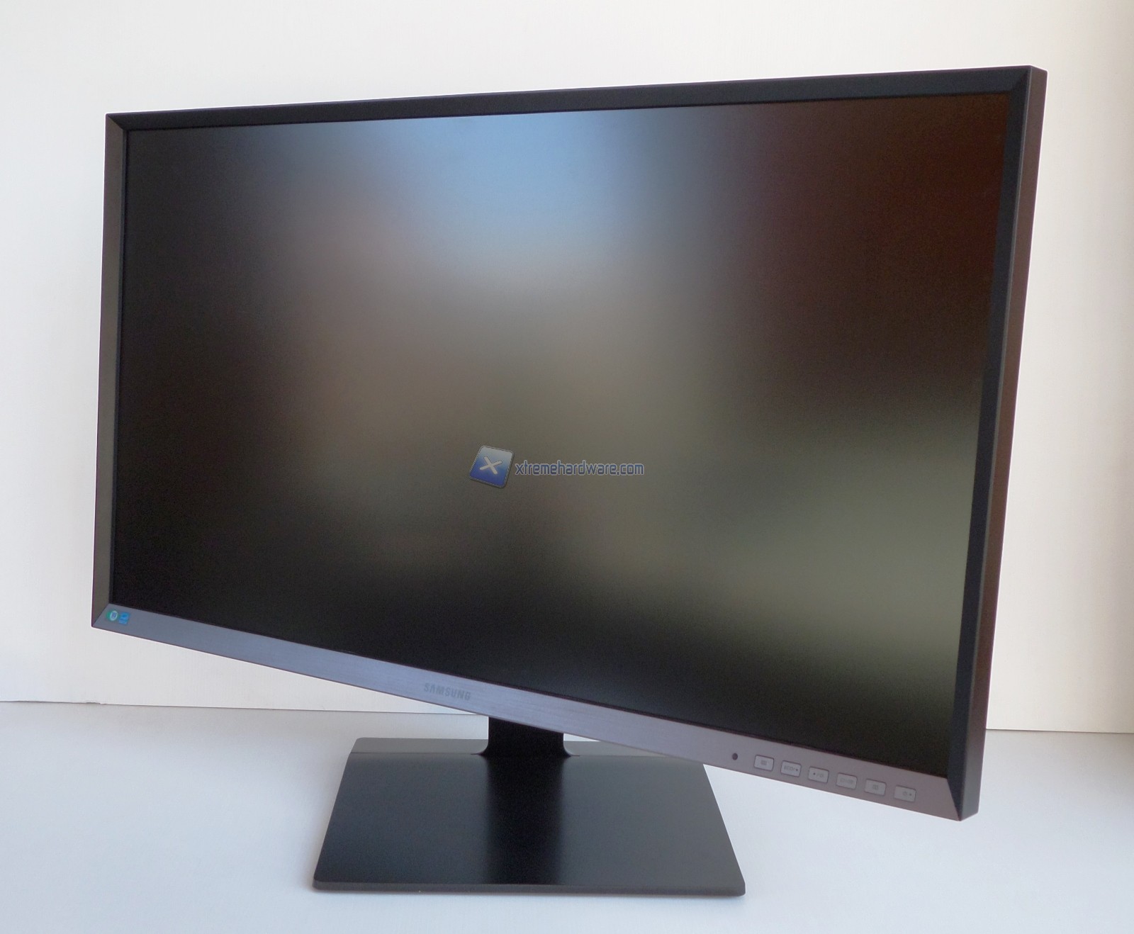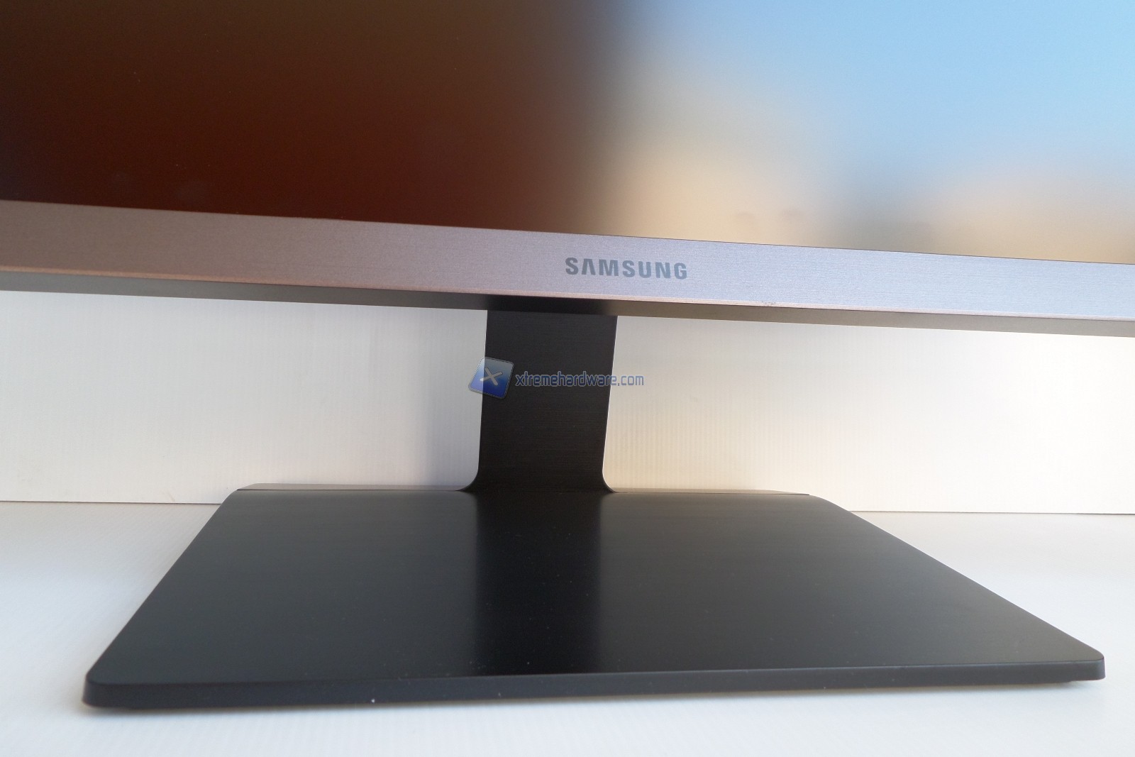 Il Samsung S32D850T si presenta decisamente elegante anche se sembra un po’ stonare con l’attuale moda che va verso un design frameless sempre più spinto. L’ampio pannello a matrice AMVA+ con rivestimento opaco di tipo leggero, tipico delle varianti VA, è circondato da cornici che convergono verso il pannello stesso e hanno spessore di circa 15 mm che sale fino a circa 25 mm per quella inferiore. Non è di certo il monitor consigliabile per eventuali configurazione multi-screen, ma difficilmente si andrebbe a guardare un prodotto di questo tipo se si ha intenzione di avere una soluzione del genere. Piuttosto elevato è anche lo spessore della scocca del display (profondità) che è di circa 30mm. A spezzare il tema nero ci pensa la cornice inferiore con effetto titanio che viene ripreso dalla parte posteriore della base di appoggio e dalla fascia presente dietro il display. Per la base misuriamo una larghezza di 30 cm e profondità di 28cm.