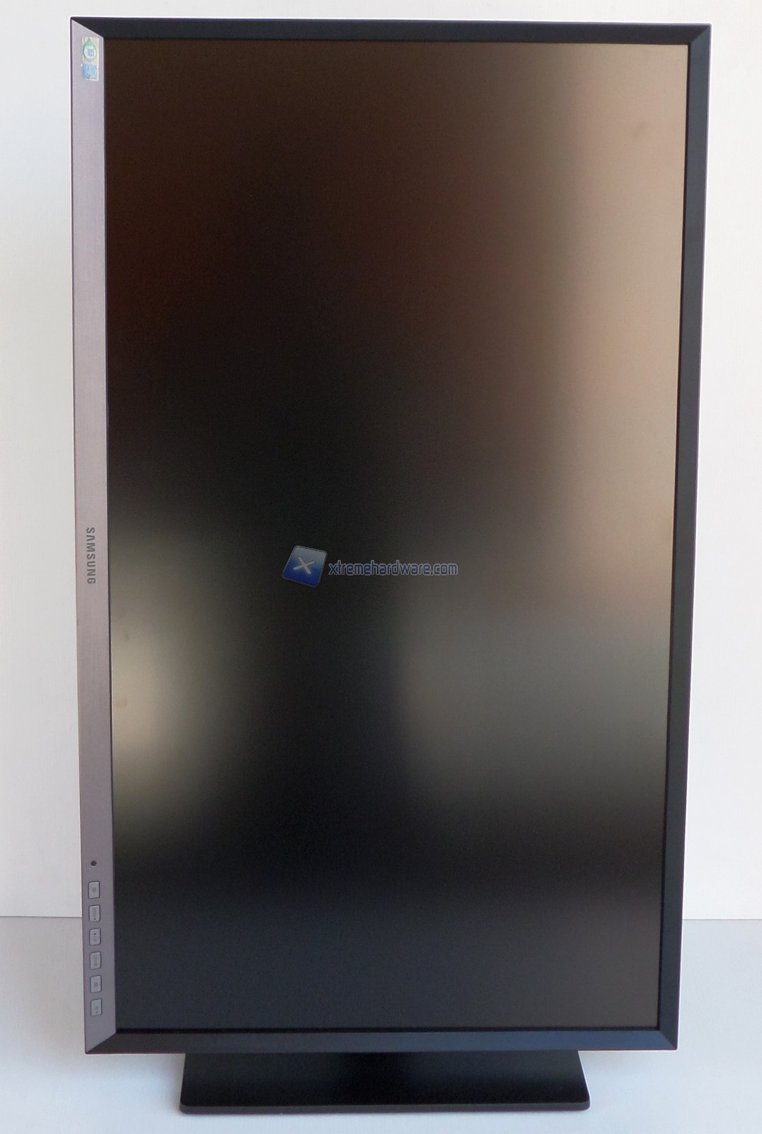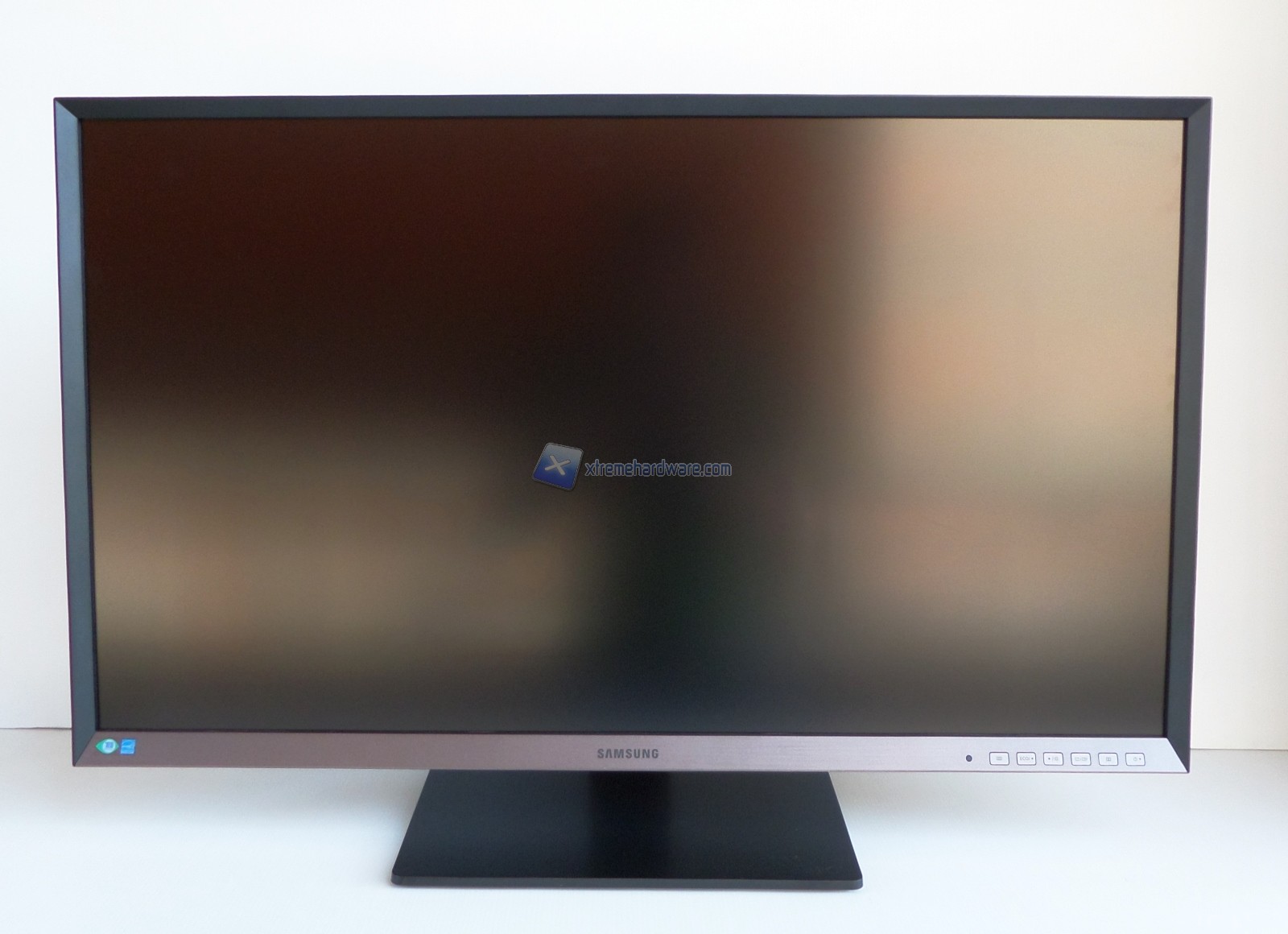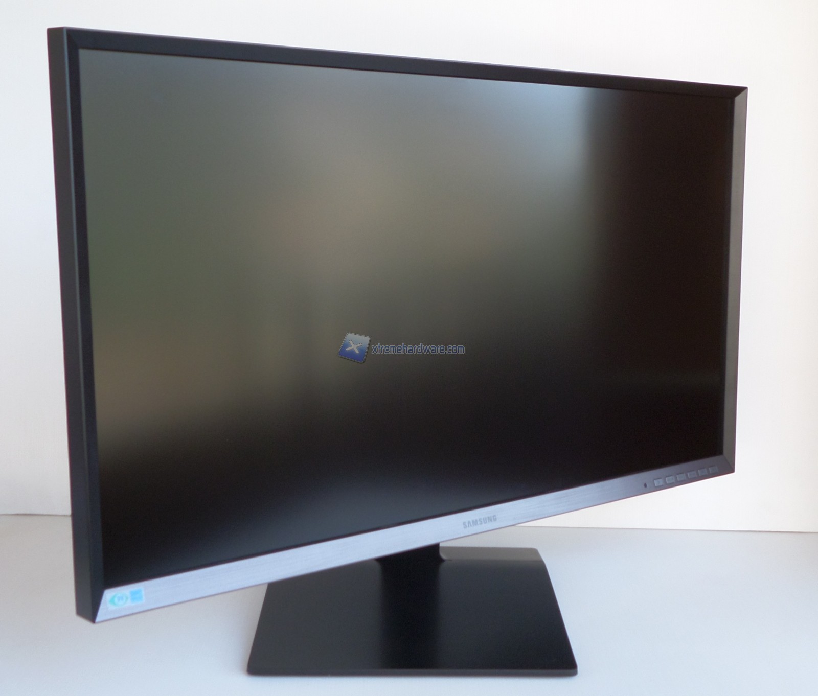 Il Samsung S32D850T si presenta decisamente elegante anche se sembra un po’ stonare con l’attuale moda che va verso un design frameless sempre più spinto. L’ampio pannello a matrice AMVA+ con rivestimento opaco di tipo leggero, tipico delle varianti VA, è circondato da cornici che convergono verso il pannello stesso e hanno spessore di circa 15 mm che sale fino a circa 25 mm per quella inferiore. Non è di certo il monitor consigliabile per eventuali configurazione multi-screen, ma difficilmente si andrebbe a guardare un prodotto di questo tipo se si ha intenzione di avere una soluzione del genere. Piuttosto elevato è anche lo spessore della scocca del display (profondità) che è di circa 30mm. A spezzare il tema nero ci pensa la cornice inferiore con effetto titanio che viene ripreso dalla parte posteriore della base di appoggio e dalla fascia presente dietro il display. Per la base misuriamo una larghezza di 30 cm e profondità di 28cm.