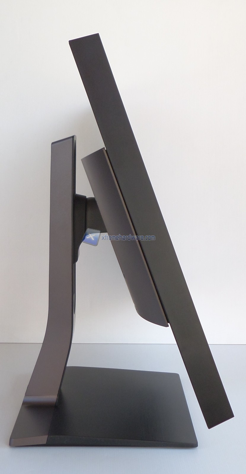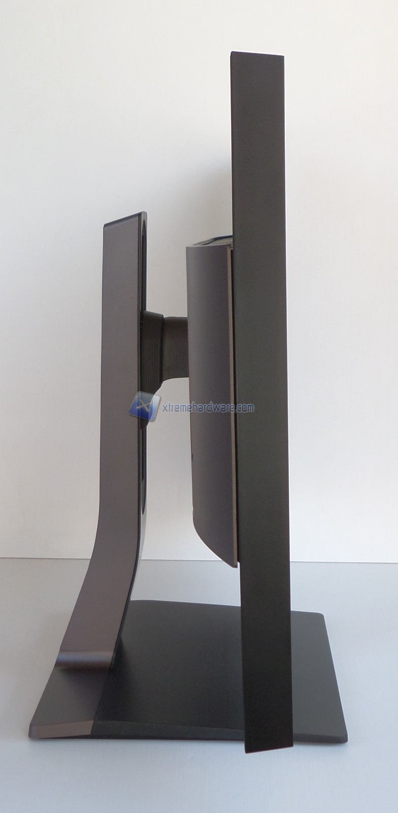 Le regolazioni ergonomiche sono soddisfacenti dato che il display può essere regolato in altezza per 130 mm, ruotato di 30° per lato, inclinato da -5° a +20° e posizionato in configurazione pivot. La regolazione dell’altezza risulta decisamente meno comoda delle altre ed è impossibile agire con una mano sola. Portando il display alla minima altezza, misuriamo una distanza tra la cornice inferiore e la scrivania di 6 cm, che salgono a 19 cm con l’altezza massima.
