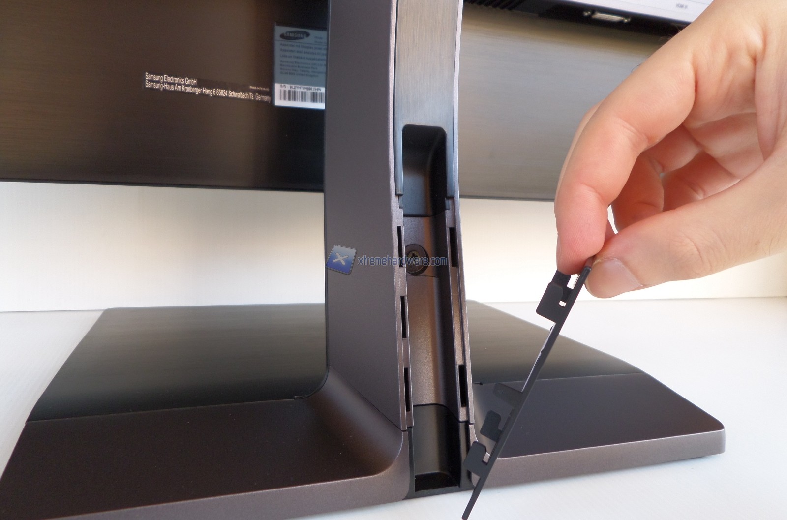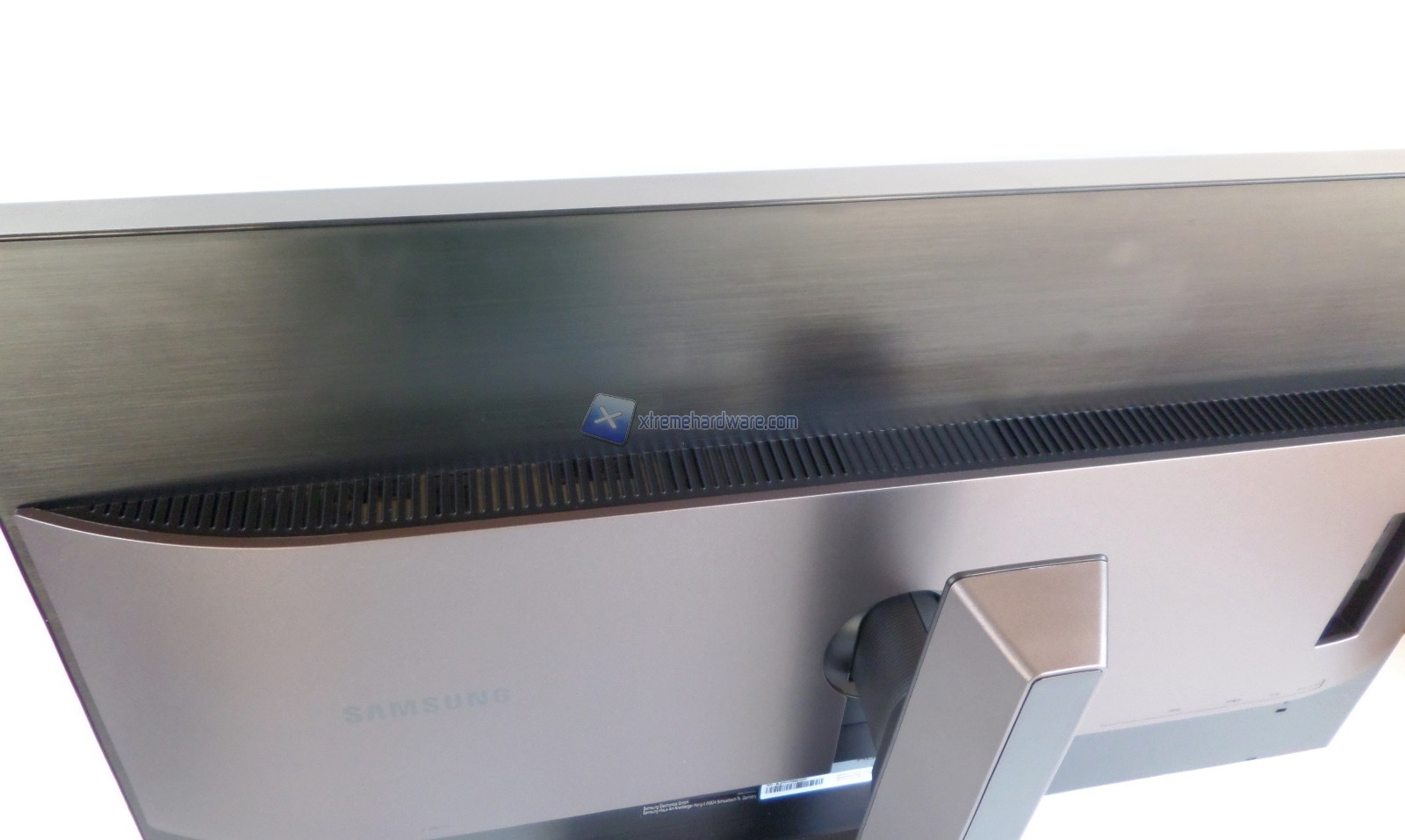 Nella parte posteriore la fascia di copertura in colore titanio può essere rimossa, come indicato nel capitolo precedente, per sfruttare la connessione VESA 100x100 mm o installare il braket per i fori 200x200 mm. Nella parte alta e inferiore sono posizionate le griglie di areazione. Sul lato destro sono presenti le quattro porte USB 3.0 e le connessioni audio di input / output; quella di input ha funzionalità nulle, dato che il Samsung S32D850T non è dotato di speaker integrati. Piuttosto imponente è il braccio di regolazione che è dotato di un raccoglitore cavi nella parte bassa dello stesso. La griglia di areazione inferiore separa la connessione di alimentazione (l’alimentatore è integrato) da quelle video. In ordine troviamo la DVI-D DL, HDMI 1.4, DisplayPort 1.2 e la porta per abilitare l’hub USB 3.0.