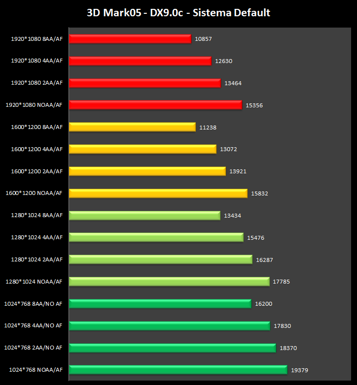 Il 3DMark05 è un programma di stress test per schede video. Basato sulle specifiche "DX9.0c", questo test richiede la presenza di una scheda compatibile con le specifiche Pixel Shader 2.0 o superiori. Sfrutta le DirectX 9.0c. Il test viene eseguito alla risoluzione nativa di 1024*768, con vari livelli di filtraggio AntiAliasing.