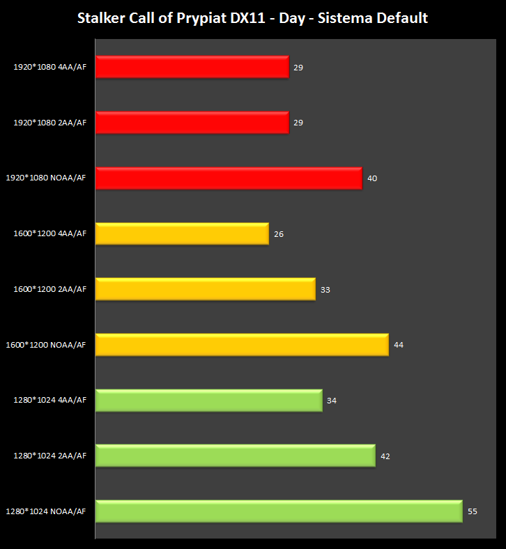 I test sono stati condotti in DirectX 11, variando solamente il livello del filtro AA e le risoluzioni. Riportiamo 4 grafici ognuno dei quali mostra la media degli fps delle seguenti ambientazioni: Day, Night, Rain, SunShafts.