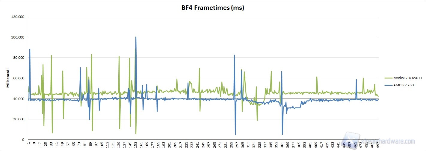 Abbiamo aggiunto per questo gioco anche un analisi dei frametimes, sull'asse delle ordinate vengono riportati i millisecondi per generare un frame, mentre sull'asse delle ascisse sono riportati i frame campione. Il miglior risultato è ottenuto dalla scheda che ha meno oscillazioni sull'asse dei millisecondi. Ecco a voi il grafico: