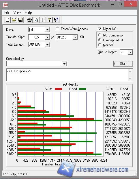 Atto è un benchmark gratuito che esegue dei semplici test in lettura e in scrittura in modalità sequenziale adoperando una Queue Depth (file in coda) di 4.